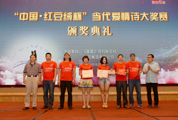 為了進一步繁榮愛情詩創(chuàng)作,弘揚正確愛情觀,特別是推動中國當(dāng)代愛情詩再度輝煌,2014年7月1日,由《星星》詩刊雜志社與紅豆集團聯(lián)合啟動了“中國?紅豆絨杯”當(dāng)代愛情詩大獎賽征文活動,作為紅豆七夕節(jié)的一項重要活動。現(xiàn)在經(jīng)過一年的征集及后期評選,在今年七夕——中國情人節(jié)前夕頒獎。