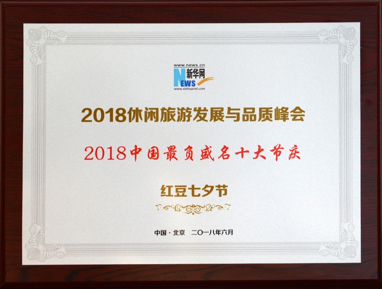 ? ? ? ? ?打造“美麗中國”,共創“美好生活”,6月24日,由新華通訊社主辦的“2018休閑旅游發展與品質峰會”在北京召開。峰會發布了“首批國民休閑旅游勝地、年度旅游匠心企業品牌、2018中國最負盛名節慶(節會)”名單。“紅豆七夕節”榮膺“2018年最負盛名十大節慶”。