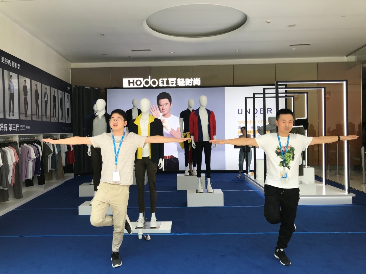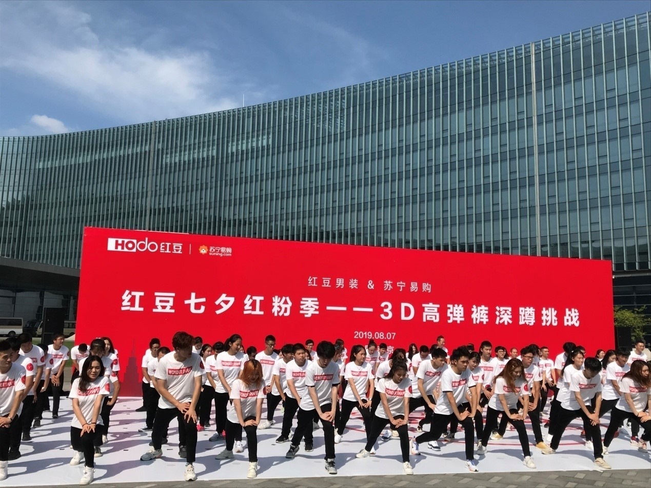 內(nèi)場的發(fā)布會全面啟動線上銷售,而外場深蹲挑戰(zhàn)是一場對高彈褲的探索,將會顛覆你對褲子的認(rèn)知,通過切身體驗(yàn)產(chǎn)品的形式更直觀地展現(xiàn)了第三代紅豆3D高彈褲的高彈力、回復(fù)性與舒適度。深蹲挑戰(zhàn)還融合了七夕的主題,77對情侶在七夕這一天身穿紅豆3D高彈褲,默契搭檔挑戰(zhàn)深蹲,在音樂的變換中完成指定動作,深蹲、弓步、抬腿……他們挑戰(zhàn)自我、配合默契,突破傳統(tǒng)褲子對身體的束縛,在展現(xiàn)3D高彈褲產(chǎn)品優(yōu)點(diǎn)的同時,增強(qiáng)彼此間的互動,也為這場挑戰(zhàn)增添了甜蜜與浪漫。這場有趣的挑戰(zhàn)更像是一次情侶間默契度的考驗(yàn),也將會成為他們難忘的七夕體驗(yàn)。紅豆的匠心產(chǎn)品與蘇寧平臺相結(jié)合,在七夕這個特殊的日子里,集結(jié)紅粉與77對情侶,用別具一格的深蹲挑戰(zhàn)形式演繹經(jīng)典產(chǎn)品的全新面貌。