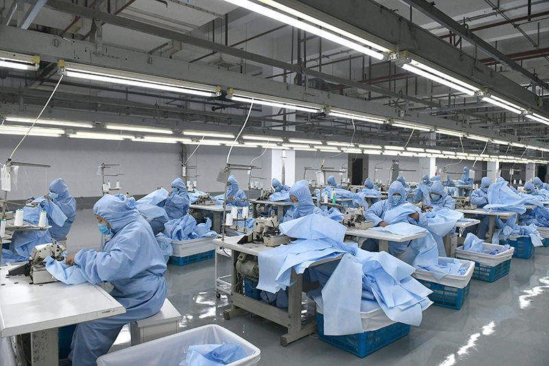 圖:連夜奮戰(zhàn)的一般防護(hù)服生產(chǎn)現(xiàn)場(chǎng)