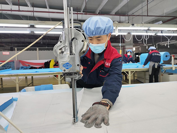 “沒有現(xiàn)成的提拉工具,就想其他辦法。先用鏟車把面料運到指定區(qū)域,為提高效率,我們用2個板凳自制了工具,順利將面料快速送上裁剪臺。”錢學(xué)民笑著說。