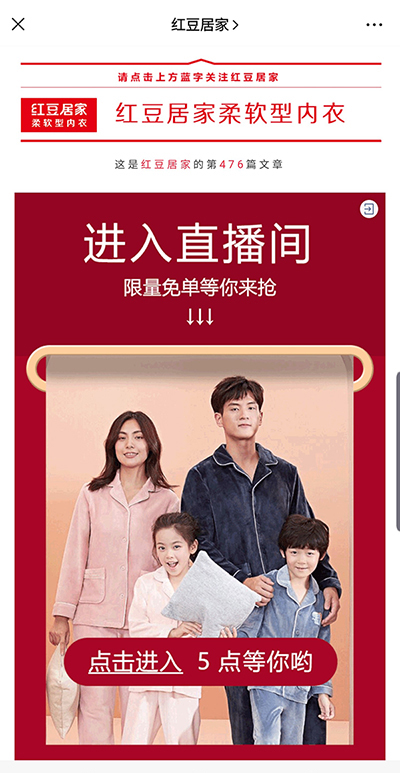 疫情來襲,“宅”成為大部分人的生活常態(tài),“紅粉”有了更多時間觀看直播,也積攢了大量消費需求。在紅豆居家的官方微信公眾號后臺,500萬紅粉熱情詢問是否有睡衣活動。在這場宅家戰(zhàn)疫中,居家睡衣或成最大剛需。2月4日紅豆居家上線“微商城”小程序。2月7日,紅豆居家推出限時閃購睡衣專場的“你需要的宅家睡衣,免郵送貨上門”,吸引25萬觀眾觀看。2月13日,紅豆居家又推出“6000萬優(yōu)惠券免費搶”主題直播,用分享給好友助力邀請的方式引流吸粉。基于紅豆居家的大流量,騰訊公司主動開放內部直播名額。2月21日,紅豆居家首次上線騰訊直播,由紅豆居家品牌文化部負責人張浩和產(chǎn)品設計負責人程莉擔任主播進行趣味互動、介紹,共吸引5.9萬次人氣,新增訂閱人數(shù)1489人,點贊數(shù)達到7.6萬多人次,直播2小時期間銷售近15萬元。