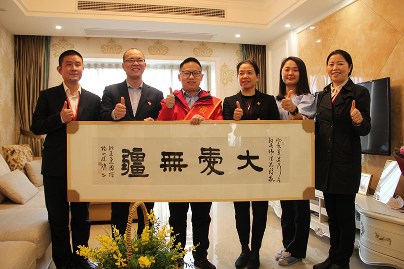 下午,紅豆集團常務副總裁、國際公司董事長戴敏君,集團品牌文化部部長錢文華率紅豆物業團隊來到殷晉偉家,上門送上最誠摯的慰問,贈予殷晉偉“大愛無疆”牌匾,代表紅豆集團全體員工向英雄表達崇高敬意!“大愛無疆”牌匾由中國書法家協會理事、無錫市國畫院院長孫璘先生親自揮毫書寫,筆鋒蒼勁有力,一筆一畫盡顯孫璘先生對“逆行英雄”的真情真意?!?/p>