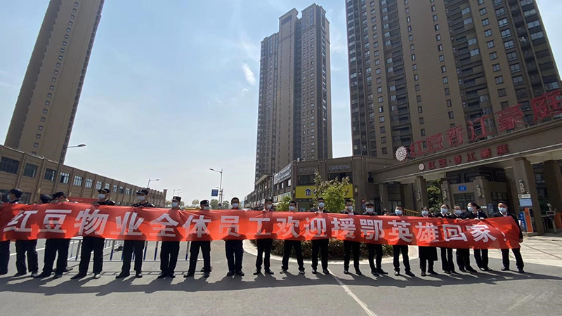 出征還是冬日,歸來已是花期。經過70多天的奮戰,武漢重啟,英雄凱旋。4月14日上午,紅豆香江豪庭小區援鄂英雄殷晉偉醫生凱旋回家,懷著對英雄的崇高敬意,紅豆物業全體員工早已列隊,手拿紅旗,拉起了歡迎條幅——“紅豆物業全體員工歡迎援鄂英雄回家”,在小區門口等候英雄的到來。