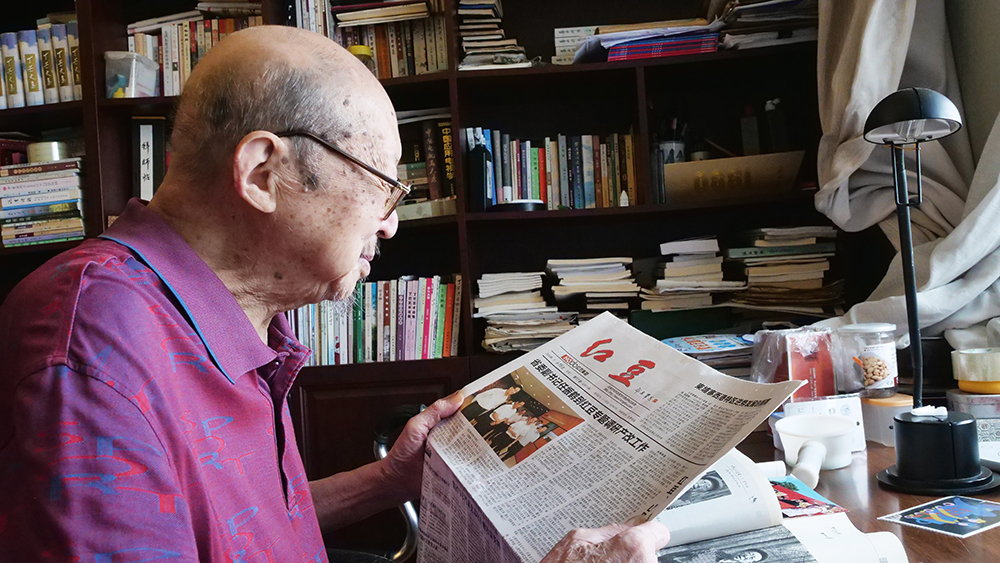 7月29日,今年的七夕前夕,當(dāng)代著名老詩人、作家、文藝評論家丁芒在家中認(rèn)真錄制著對紅豆七夕節(jié)20周年的祝福視頻。中國當(dāng)代詩壇曾有“北臧南丁”之說。丁芒,這位從南通城走出來的大詩人,從抗日戰(zhàn)爭的烽火開始生命的吟唱,80載筆墨為伴,書寫了萬余首激蕩人心的詩篇。面對記者的拜訪,丁芒和其夫人都十分熱情。現(xiàn)已96歲高齡的他,看起來依舊面色紅潤,精神飽滿。在丁芒老先生家中,能夠感受到濃濃的文化氣息,書柜上、書桌上擺滿了各種書籍。雖然已是耄耋之年,丁芒老先生依然每天以書籍為精神食糧,在他的身上,我們看到了一個詩人對詩詞的忠貞和熱愛,對傳統(tǒng)文化的敬畏和崇拜。