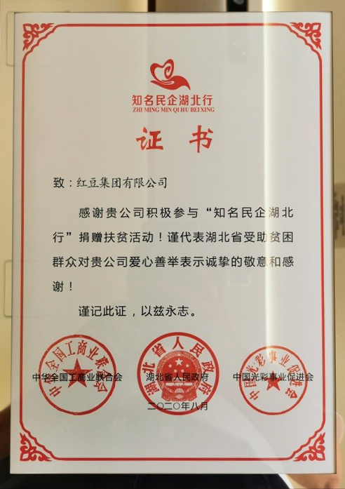 “在湖北最困難的時期搭把手、拉一把”,是習(xí)近平總書記在湖北省考察新冠肺炎疫情防控工作時作出的重要指示。紅豆集團積極響應(yīng)總書記指示精神,向湖北省扶貧基金會捐贈100萬元支持湖北省抗疫重振,目前已用于支持湖北黃岡市、隨州市隨縣等地區(qū)共計500位貧困人口脫貧,受到湖北省工商聯(lián)的表彰和感謝。此次大會上,全國工商聯(lián)、湖北省委省政府和中國光彩會領(lǐng)導(dǎo)為紅豆集團等民營企業(yè)代表頒發(fā)了榮譽證書,對企業(yè)積極參與湖北行捐贈扶貧活動表示感謝。
