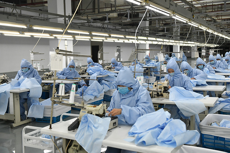 2月5日下午,走進紅豆股份新建成的西服車間,只見一派熱火朝天的繁忙景象。面對疫情,這個新車間一夜之間被改造成的防護服生產(chǎn)車間,200多名工人戴著口罩,正在加緊趕制防護服?!胺雷o服是緊缺的醫(yī)療物資。為了支援抗疫前線,我們2月1日啟動了防護服生產(chǎn)?!奔t豆股份常務(wù)副總經(jīng)理顧金龍介紹,起初,大家心里都沒底,畢竟沒涉足過這個領(lǐng)域。但紅豆股份有成熟的服裝生產(chǎn)技術(shù),為一般防護服實現(xiàn)快速生產(chǎn)創(chuàng)造了有利條件。