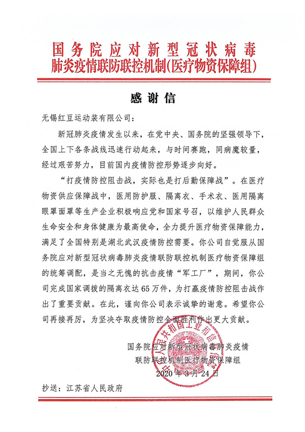 這是3月24日,紅豆集團下屬的紅豆運動裝公司收到國務院應對新型冠狀病毒肺炎疫情聯防聯控機制醫(yī)療物資保障組的感謝信中的一段話。